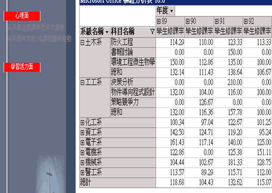 分析1:各系學生修課率TOP3之課程歷年來趨勢詳細資料 顯示各系前三名課程名稱及歷年來修課率趨勢