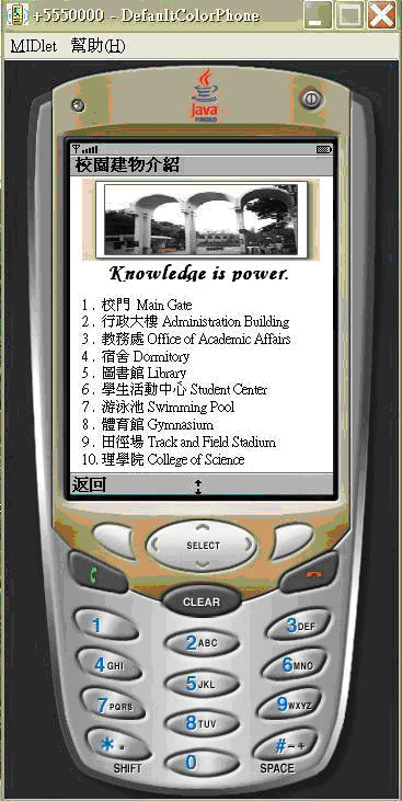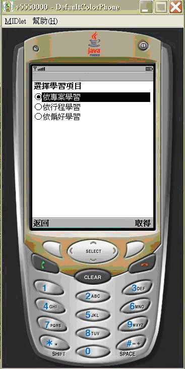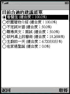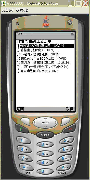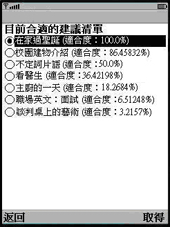 當某甲漫步在校園中突然想要學習校園中那些特殊建築物的英文名稱時,某甲可以利用身上的手持裝置(以手機模擬器展示)連線登入到本系統平台取得相關學習資源。系統根據登入者的帳號名稱由資料庫中取得某甲的學習狀態,再將相關資訊初始化成User Profile各項元件,User Profile以學習者的學習狀態指向適合的階度,並從該階中學習物件屬性描述推論適合某甲當下環境的推薦清單順序,以下由各圖展示運作流程。