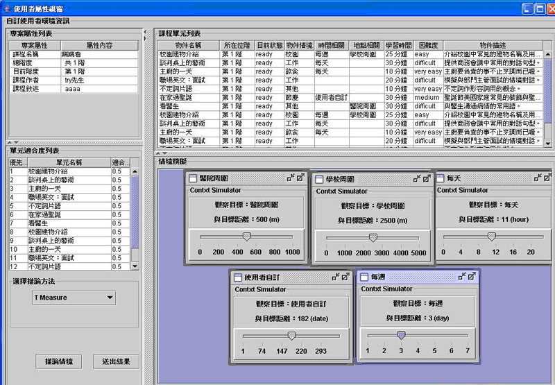 我們以大學生某甲學習者為例,假設某甲已經透過學習者者主控台註冊到本學習平台中並已新增學習專案,以下就是透過Fuzzy推論,針對時間跟地點的不同,呈現出的情境模擬: