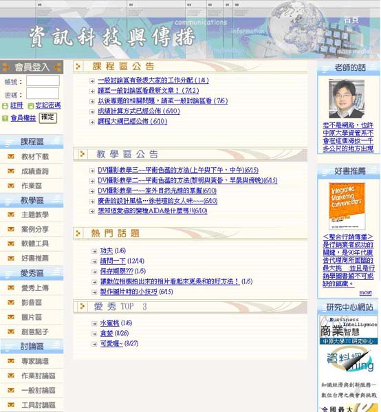 首頁: 放置最新公告、老師的話、會員登入、最新消息、相關連結和好書介紹,又將最新消息分成幾個重要功能的區塊,讓使用者方便使用。 |