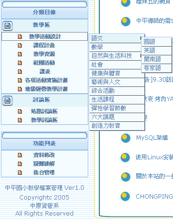 Ⅰ教學區: 此區主要分為「教學活動設計」、「課程計畫」、「成績單」、「試題庫」、「教學資源」、「社團活動」、「課表」、「各項活動實施計畫」、「班級經營教學計畫」等項目,以下將對於以上項目加以說明: 教學活動設計: 這部份在於課程以及教學活動當中,擺放教師額外所做出提供參考的額外資料。老師們可以把教學中的活動設計分享出來,提供一些心得給大家參考。 課程計畫: 如同各科目的課程綱要,是詳細介紹每週的規劃,把每週的時間安排都規劃好,老師們可以照著所規劃好的表進行教學,如此可以更加地妥善利用時間,做好對時間的掌控。 成績單: 此區為提供存放成績單的區域,老師們上傳所負責的該班學生成績單,其中,為必免學生人數太多造成紀錄太過繁雜,因此以年級作為分類的依據,使此區的紀錄更能有條不紊,增加此區紀錄的可讀性。 試題庫: 此區可存放各科的試題練習,其中,因為語文、數學、社會、自然、健體等科目比較有考試活動,因此此區的試題以這幾類為主。 教學資源: 此範圍是做為教師在教學時期,所需要的附屬資源材料,如各式的資料提供,讓教師在尋找資源方面能更快的取得。另外,教育局所發下來的公文也會存放在這一區裡,因此,此區在教學上對老師而言猶如寶庫一般,老師們可以在此區找到所需要的教學資源,其中,分類的是以領域來做為分類的依據。 社團活動: 社團活動 ( 年級 ) ,有關社團活動的一切紀錄,如社團的教學計畫,社團活動進度表,社團名冊等會員以及訪客可在此瀏覽或下載與社團活動相關的訊息 ,紀錄分類的方式是以年級為依據,透過此方式來將紀錄分門別類,增加紀錄的可讀性,也提高使用者使用的意願。 課表: 此區是提供老師們上傳班級的課表,以提供查詢之用。課表是以「 低、中、高年級、行政科任」來進行分類的動作。 各項活動實施計畫: 包含了各處室欲在學校推動某些活動,如母親節卡片比賽,生活輔導相關事項等等,在本區可以下載該活動的相關附件。如活動報名表,活動實施計劃 ( 辦法 ) ,使得訊息得以傳遞到校園。 ( 包含:處室:教務處,訓導處,輔導室 ) 。 班級經營教學計畫: 此為班導師可以規劃班級活動的功能,班級導師可以規劃班級上的大小事,如班級幹部選舉、教室佈置、教室課桌椅擺設、班級清掃規劃等,導師亦可做課程的計畫,譬如課程時間多久、課程活動的排程等,都可以在此板做計劃。 |