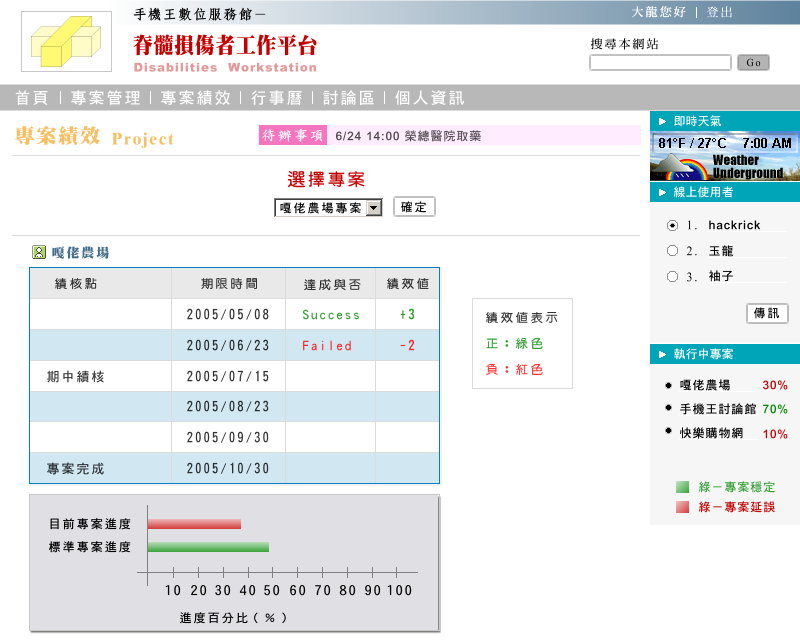 在專案稽核中,選擇一個執行中的專案,就可以看到在工作項目的期限時間,以及完成與否,和稽核值。一樣以紅、綠色來區分。而在畫面的下方可以看到專案目前的進度,是否有延誤標準專案進度。