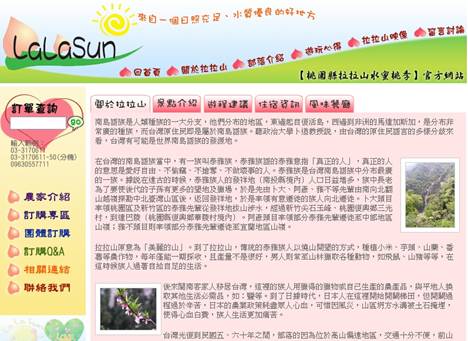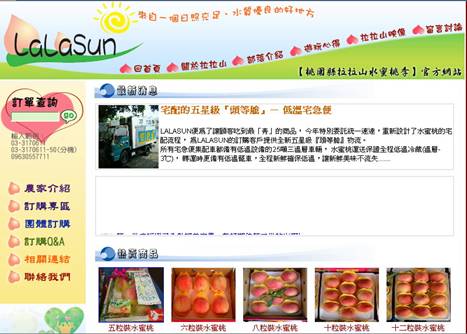 時代不斷變遷,網際網路已成為僅次於電視的第二大媒體,消費者多可利用網路訂購自己想要的商品;有鑑於此,為了讓社會大眾吃到全世界最好的水蜜桃-拉拉山水蜜桃,「桃販集團」架設 LaLaSun網站,藉由網路行銷的手法,讓資訊傳播,每個客戶可以從近百位水蜜桃達人中挑選喜歡的水蜜桃。