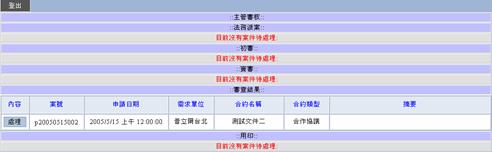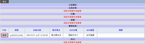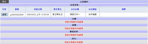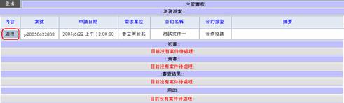 若出現以上訊息即表示主管審核工作已經完成,按回列表按鈕回到出現等待法務主管審查結果的列表。