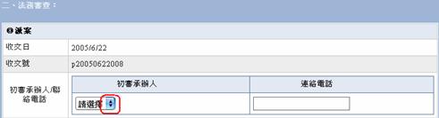 在初審承辦人欄位點選上下三角形按鈕下拉並選擇初審之承辦人,可以派案給法務部主管本人或是法務部人員,並輸入初審承辦人連絡電話。