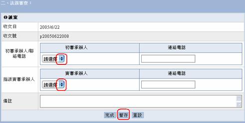 由於法務部主管派案給初審和實審人員之決定也許經過商討後會加以更改人選,因此也可以選擇暫存按鈕將目前的派案人員先暫時存起來,之後再加以修改。