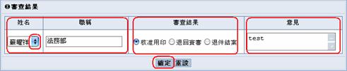 在姓名爛位中選上下三角形按鈕下拉選擇審查人員之姓名後,系統會自動加入該位人員之職稱。之後請點選審查結果欄位中核准用印、退回時審、退件結案前的小圓圓,若有審查意見的話請在意見欄位的框框中填入。之後請按確定新增審查結果。