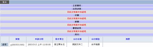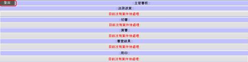回到等待法務部主管等待用印案件的列表如上圖,由於等待用印之案件已用印結案,因此目前沒有需用印案件等待處理。請點選登出按鈕登出系統。