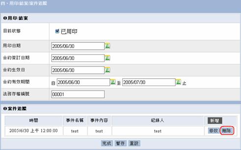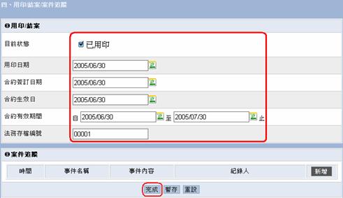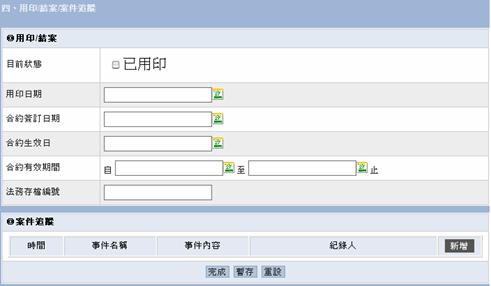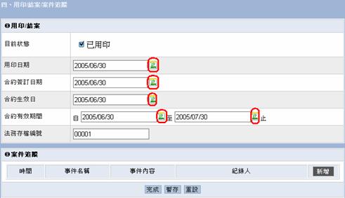 如果案件已經用印請勾選已用印前方的小框框,並點選用印日期、合約簽訂日期、合約生效日、合約有效期間框框後的小日曆出現日期選擇視窗,並加入該項日期。
