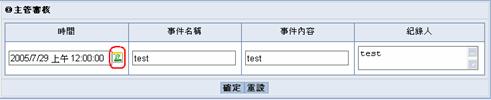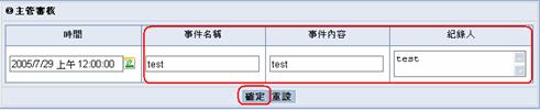 日期輸入完畢後,在事件名稱、事件內容、紀錄人的欄位中填入資料,並選擇確定按鈕。