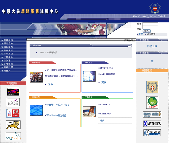 此頁為首頁,右上方為登入的欄位,註冊中心的功能需要登入才能使用,左方為選單,提供系統的說明和核心的功能--註冊中心。畫面左下和右下分別為相關技術的參考網站和本站的相關資源。