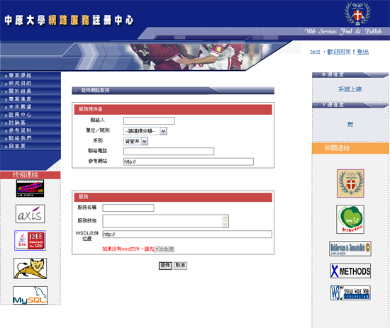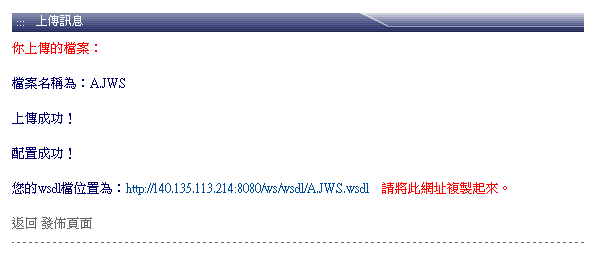 此頁為「發佈」的畫面,使用者將會在這個頁面填寫關於此服務的相關資料,以及最關鍵的資訊--WSDL位置,若使用者沒有服務的WSDL,可以使用本系統最大的特色-WSDL轉換機制,將服務上傳,由本系統為您轉換。成功之後會回報一WSDL位置,使用者可將此位置複製下來,以便發佈時使用。