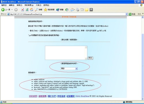 在此功能項目裡,是針對書名、作者、出版社等等需加強搜尋精準度的特殊需求, 在頁面中,我們並提供「查詢範例」,方便網路使用者在看完範例後,在使用尋找的功能容易上手、找到想要的資訊服務,減短了使用者花費在搜尋選購特殊書的時間;並且增進一項「查詢資料排序」,可以依使用者的偏好選擇,如:最佳銷售、平均顧客瀏覽次數、售價由低到高的排序、發行日期、依書名排序等,這些貼心服務讓使用者能觀查到更多的消息內容。