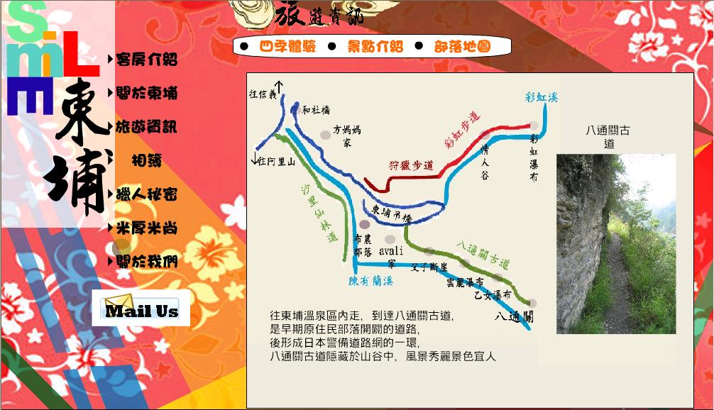 有別於客房介紹,此部分著重於整個南投縣信義鄉東埔地區的資訊,簡單 的地圖道路連接各個景點讓瀏覽者可以初步認識這個地方,並在這些景點 解釋由來和特殊涵義,以求讓人有一種前往探訪的心動感,最後加上電子 地圖的功能讓人更清楚所在地為何。