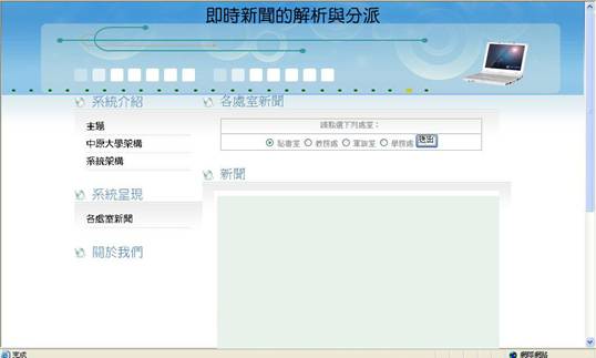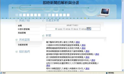各處室新聞展示了新進文件經由語意分析後,依照本體裡建構的規則,將會推論至所屬的分類,這個頁面可以展示本體內不同分類的新聞。選擇所想閱覽的處室,按下送出後,即可看到相關的RSS新聞,按下後面的「連結」,新聞頁面將在新視窗出現。