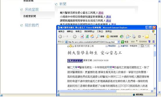 以「輔大醫學系師生愛心當志工-民視」為例,按下該則新聞後面的連結後,即跳出該則新聞的頁面。