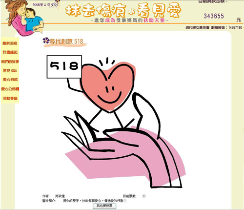 「尋找創意518」目的是宣導基金會 “扶一把”的意義,希望能吸引到社會大眾注意到家暴媽媽這個議題,並捐款給基金會幫助這些家暴媽媽,活動是以網路徵圖的方式進行,參加者自行創作或尋找圖片中含有518數字或是扶一把涵意之圖片,並上傳至網站,活動期間由網友進行票選,等活動截止依票數選出得獎者。