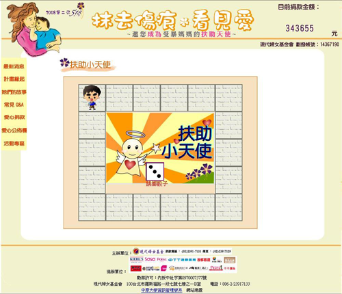 「扶助小天使」是一個以大富翁型態進行的問答小遊戲,參加者擲完骰子後,畫面上的可愛人物便會按照點數前進,地圖上的每一格都會跳出關於活動網站、基金會、家暴知識的問題讓參加者選填選項,突破所有難題達到終點,遊戲便已成功完成。
