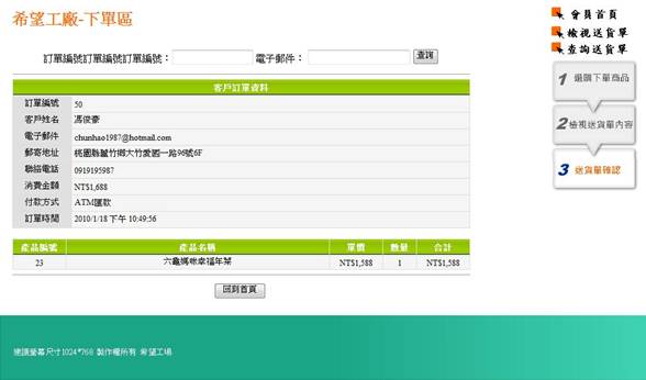 輸入正確,顯示單筆訂單資訊。