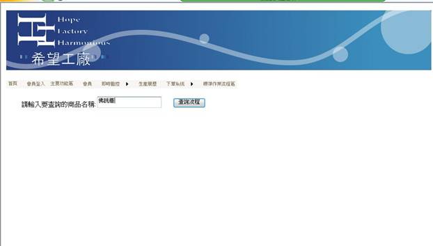 在訂單清單存檔區選擇,SOP標準作業流程,在此畫面,將欲查詢產品名稱輸入製框框中,按下查詢流程。