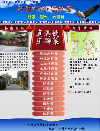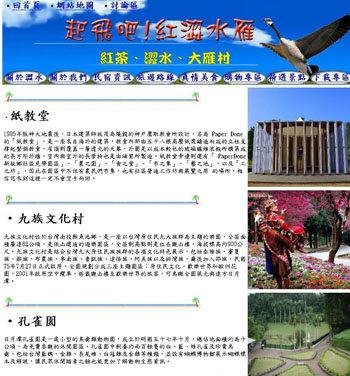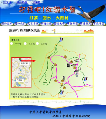 製作 Flash 旅遊動畫的活潑介面,標示出民宿、景點、美食的位置,且貼心準備規劃好的行程表,行程表中有 各景點的代表圖片,假 如點選詳細行程介紹,將會得到更豐富的訊息。