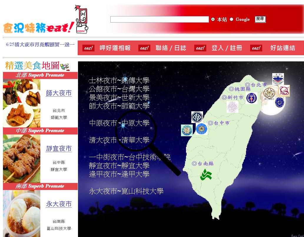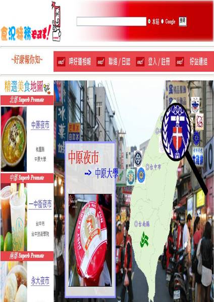 精選美食地圖:在首頁的左方的精選美食地圖選,分為北、中、南三個地區,會隨時變更三個地區內所有的大學周邊夜市圖片與夜市名稱,提供使用者方便找尋他們所需要的夜市。而內附有夜市的導覽圖提供店家位置,讓民眾參考行走路線與店家資訊告知民眾知名的店家或者知名的食品和售價,且附有店家照片方便民眾更容易找尋所要購買店家。 |