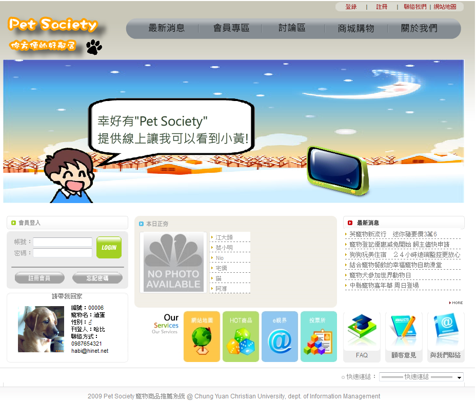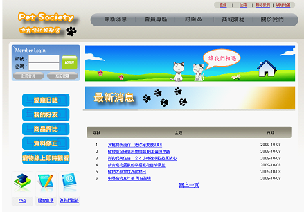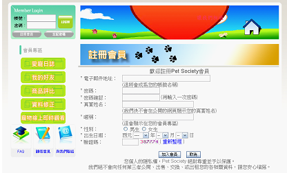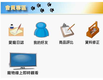 會員專區為本站一般會員之功能,有愛寵日誌、我的好友、商品評比、資料修正以及寵物線上即時觀看等功能