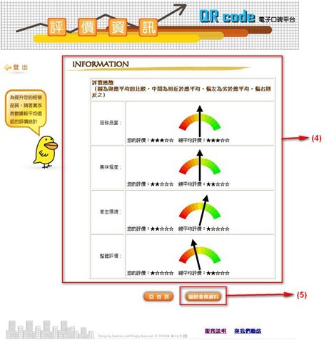 4.首先,進入後台即可看到目前消費者對於自己商家的評價,另外本系統也提供其他商家的平均值供商家參考,經由比較可以知道目前商家相較於其他商家的弱勢在哪裡。