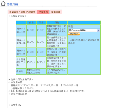 在這裡我們為當地的民宿作詳細的介紹,並把標記出各家的特色,讓遊客來到這裡時,不用再煩惱。在這裡還有一個最大的特色,當遊客向民宿電話訂房後,擁有Paypal帳戶的訪客即可使用Paypal付款機制,做線上付款的動作,省下了出門匯款的時間。另外,民宿主人可以在自己的民宿頁中留下想說的話,除了傳達當地的聲音,更能拉近民宿主人與訪客間的距離。