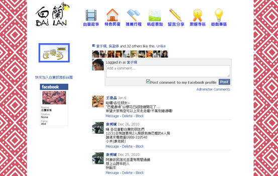 留言版使用熱門的facebook聯外通技術,開放給大家做心得分享、資訊交流用,運用facebook廣大會員量增加網站曝光度。對於曾去過白蘭的訪客,可以在這裡發表自己的感想或遊記;對於未曾到過白蘭的訪客,也可以在這裡做詢問、交流資訊。並且在頁面左側,設有白蘭部落的facebook粉絲頁連結及手機王的白蘭討論區,將兩邊做結合。
