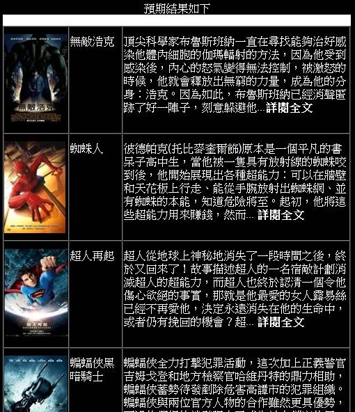 當勾選出對應的成員&結構,系統就會出現上面的畫面,表示合乎該類別、概念的電影有這些。 |