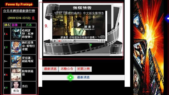 8.最新票房排行榜(提供每週台北新上檔電影的票房) 9.強檔預告(提供強檔電影的預告片段) |