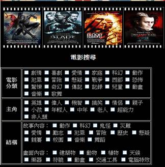 進入電影搜尋後,就會來到這個分別對電影的成員&結構來協助搜尋的頁面,只要勾選出對應的成員&結構,我們系統就會整理出合乎以上所勾選的電影。 |