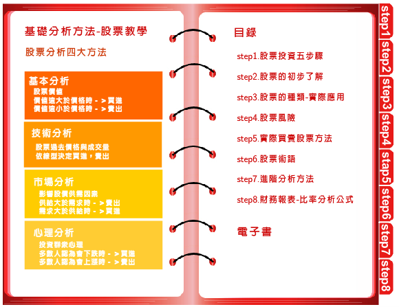 本系統建置股票投資的教學,將歸類似的面相作為學習的方向,引導使用者一步一步的逐漸了解投資的方法,以及掌握投資之技巧。