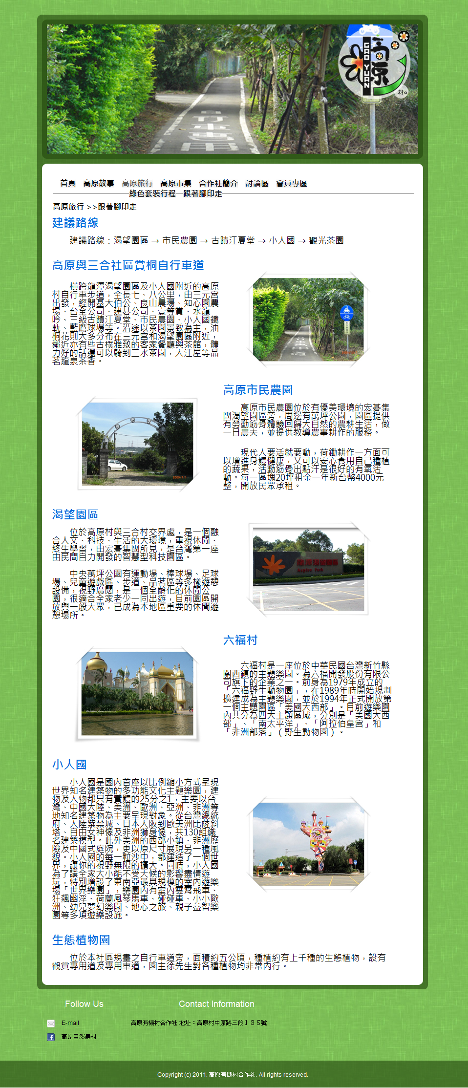 內容分為個人跟著腳印走與綠色套裝行程,前者為高原村自行車步道旅遊介紹;後者為高原村基本景點旅遊介紹,會定期更新高原村即時資訊,提供訪客最完整的高原資訊。