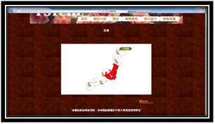 若點選日本,會進入日本地圖頁面,當指標移到釘子上,會出現該區的地名。點入下方"more"後會為使用者分類好各種不同類型的名勝景點介紹。