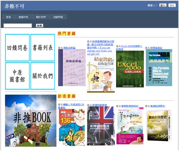 本介面為〝非推Book〞的首頁,透過簡單的架構概念,讓訪客一進入 就可以看見熱門書籍排行與新進書籍。 左上方的搜尋關鍵字列,主要為提供未登入者(或新舊使用者)輸入想查詢的書籍、作者。