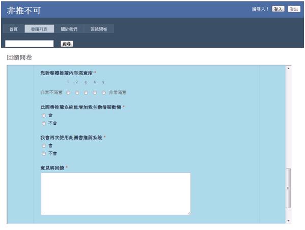 若使用者對系統有更加多的意見,透過此頁面中,簡單的問題選擇或是自由式的留言方格,讓我們知道系統有何改進空間以及向未來發展。