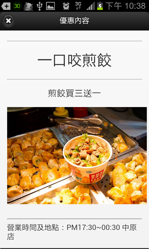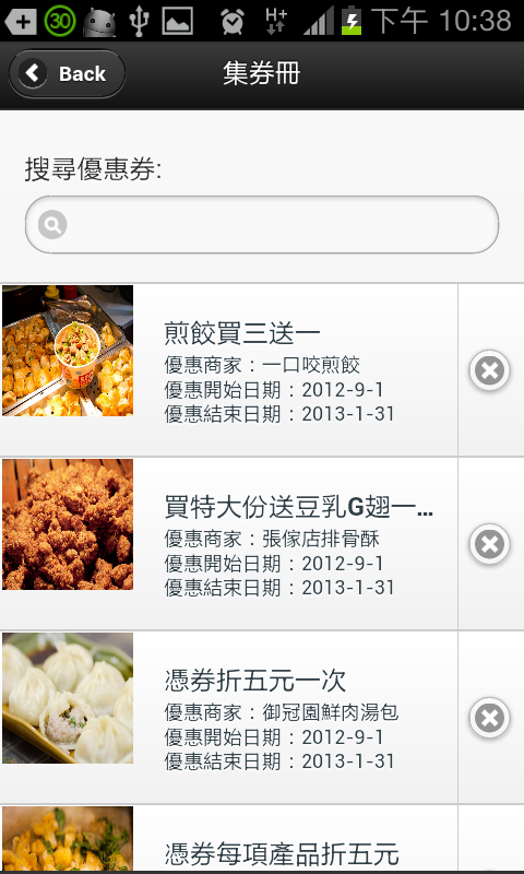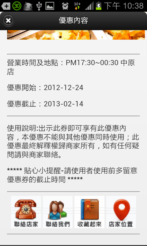 首先點選「集券冊」→點選任一優惠券→會出現該優惠內容(包含: 商家名稱、優惠內容、美食照片、營業資訊、優惠期間、使用說明)。