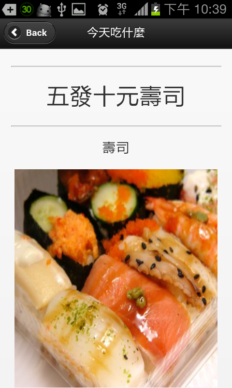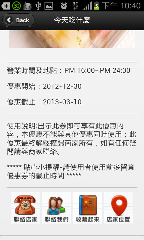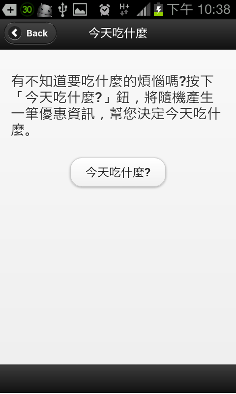 首先點選「今天吃什麼」→點下 今天吃什麼? 按鈕→將會隨機提供使用者新的選擇(包含: 商家名稱、優惠內容、美食照片、營業資訊、優惠期間、使用說明)。
