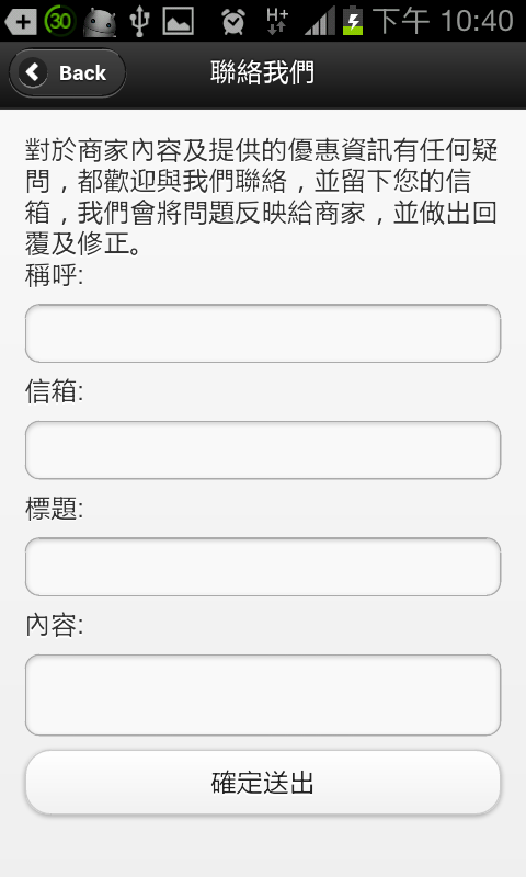 問題回饋:對於該App若有任何問題,如資訊尚未更改、系統功能可以改進的地方,皆可以透過此功能與本專案團隊進行回饋服務,本專案會依照使用者的意見與建議進行更完整的系統服務。