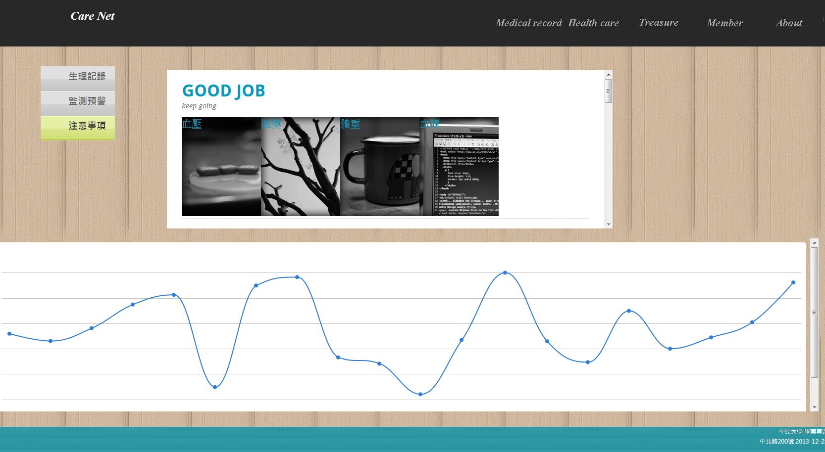 提供血壓、脈搏、體溫、血糖之生理輸入,並進行資料格式審合,系統抓取合理資料,繪製折線圖。