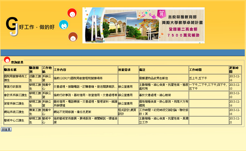 ●找工作-條件分為工作地點及工作類別 ●工作類別-學期工讀生(需要長期服務)、專案工讀生(需要配合部門專案進行,通常需要特殊技能)、活動工讀生(臨時工讀生,協助部門舉辦活動)