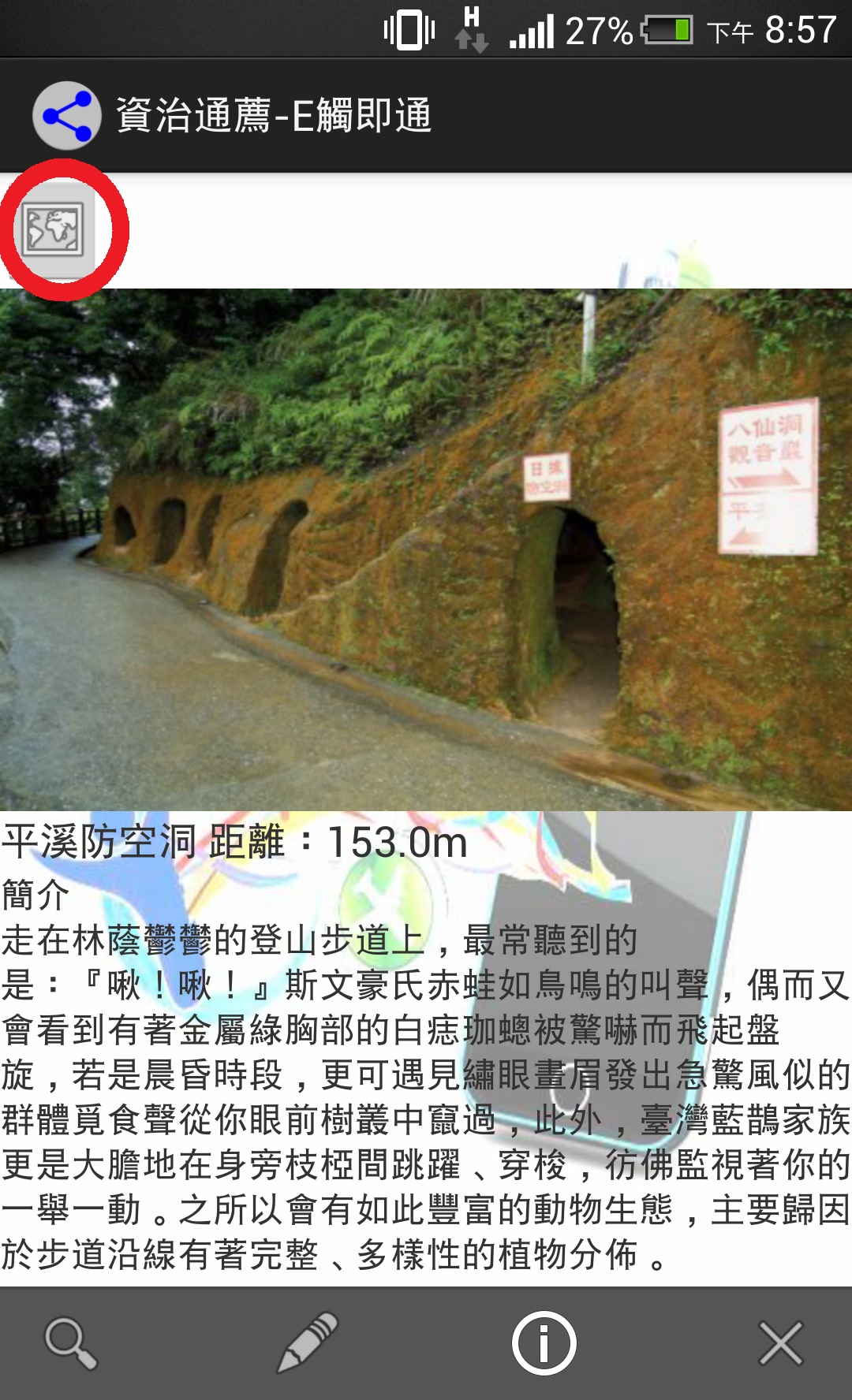 ※通知或推薦後按下顯示鈕,會出現景點圖片、距離目前位置、簡介,左上角的小地圖按下會顯示地圖。