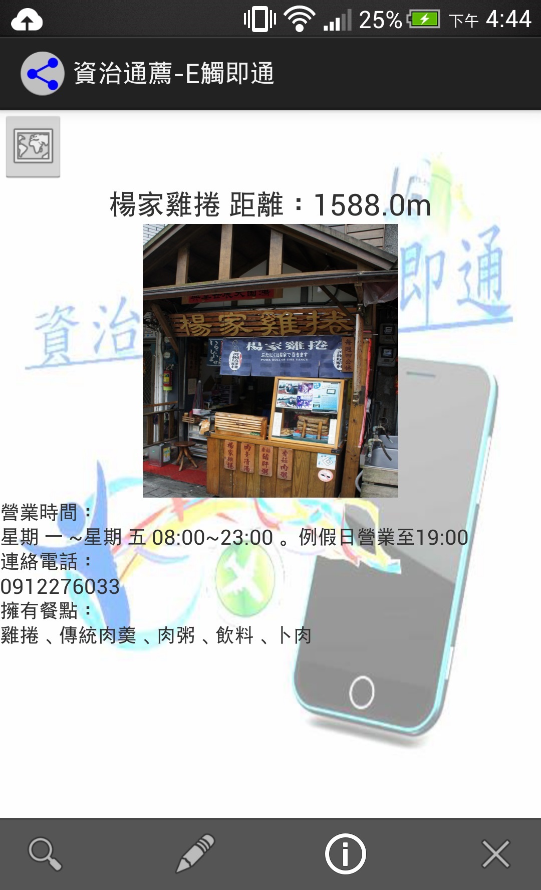 ※點選楊家雞捲後,顯示店家的營業時間、連絡電話、餐點資訊、距離目前位置、左上角也有地圖提供使用者觀看。
