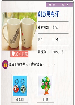禮物區分為類別和價格區塊放置與合作商家的廣告連結以紀念類為例